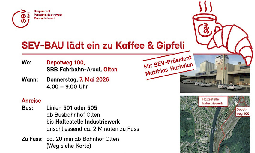Die SEV-Sektion Nordwestschweiz lädt herzlich zu Kaffee & Gipfeli im SBB Fahrbahn-Areal in Olten ein. Nutze die Gelegenheit für einen persönlichen Austausch – mit dabei ist auch SEV-Präsident Matthias Hartwich.