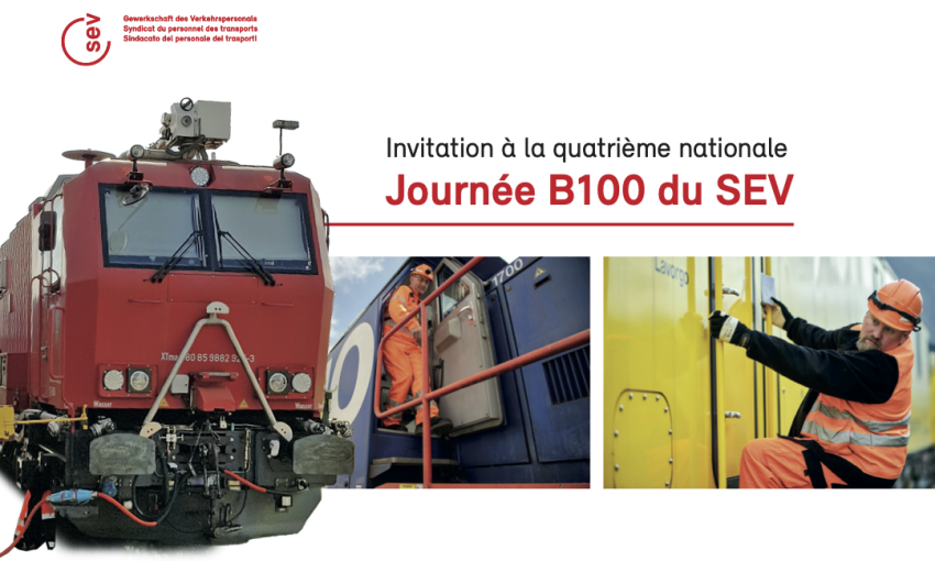 Le SEV invite toutes les mécaniciennes et tous les mécaniciens B100 des CFF et de CFF Cargo à la quatrième rencontre nationale à Berne. Ensemble, nous discuterons des défis, échangerons des informations et formulerons des revendications pour l’avenir. La participation est récompensée par un chèque-congé des CFF.